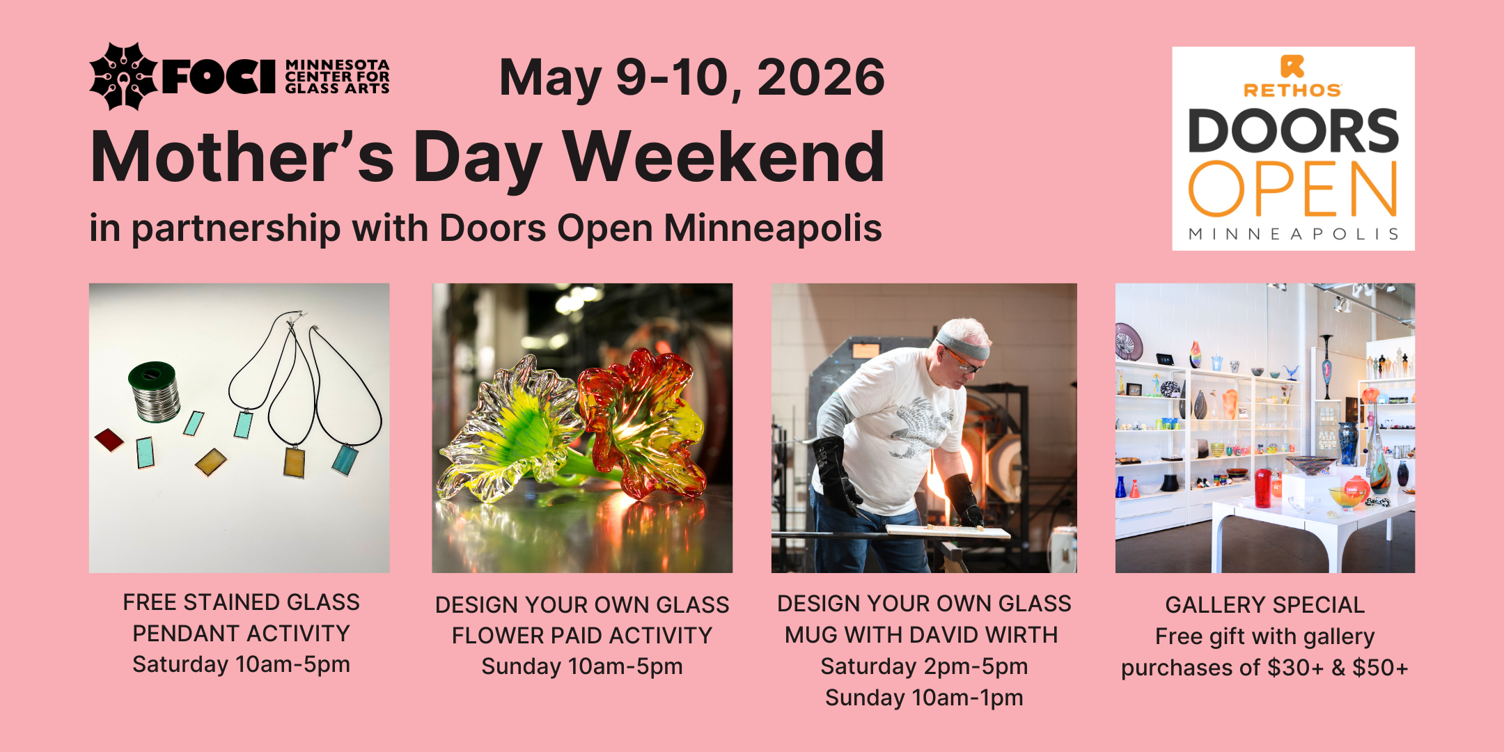 Throughout both days, Foci MCGA will host a promotional gallery sale featuring handmade glass artwork. Visitors who spend $30 will receive a free glass item, encouraging exploration of our gallery and supporting local artists. Offer is non-transferrable and only valid during Doors Open Minneapolis while supplies last.